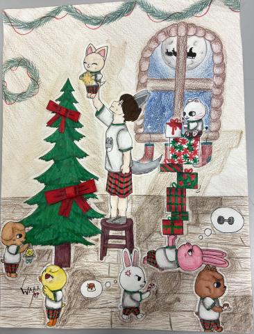 Bravo à Elsa et Clara qui remportent la première place du concours de dessin avec leur scène de Noël pleine d'humour et de petits détails !